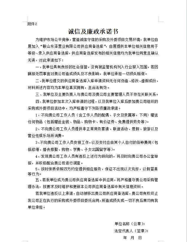 1.請(qǐng)有意向的企業(yè)按要求填寫《供應(yīng)商入庫登記備案信息表》(見附件1)和《供應(yīng)商誠信承諾書》(見附件2)。請(qǐng)將填寫完畢并加蓋公章的上述資料掃描件,以及營業(yè)執(zhí)照的掃描件,發(fā)送至指定郵箱asdc2017@163.com。同時(shí),企業(yè)也可選擇將蓋章的紙質(zhì)版資料和營業(yè)執(zhí)照復(fù)印件(同樣需加蓋公章)送至鞍山市鐵東區(qū)建國大道21號(hào)206辦公室。如有任何疑問或需要協(xié)助,請(qǐng)撥打聯(lián)系電話:15141215535。